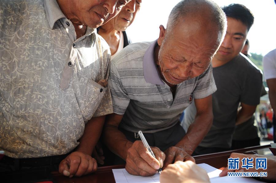 7月17日,米脂县杨家沟村村民刘佩军在领取分红后签字。 新华社记者 张博文 摄