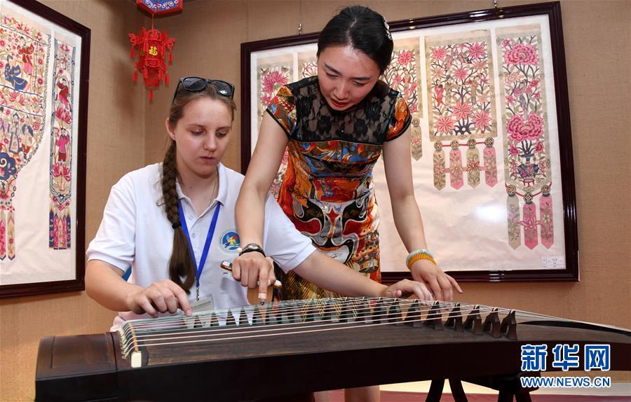 7月17日,来自哈萨克斯坦的萨莎(左)在学习古筝弹奏。 当日,第三届上海合作组织青年交流营的营员在青岛参加了一场别开生面的民俗互动体验活动,感受中国传统文化。 新华社记者 李紫恒摄
