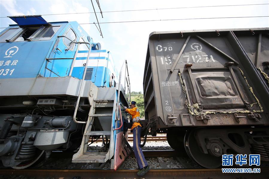 7月17日,在贵州省凯里车务段玉屏火车站,制动员刘祖晗在摘接车辆软管。 新华社发(黄晓海 摄)