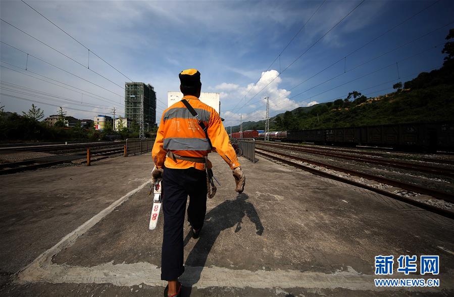 7月17日,在贵州省凯里车务段玉屏火车站,连结员刘健前往车辆作业。 新华社发(黄晓海 摄)