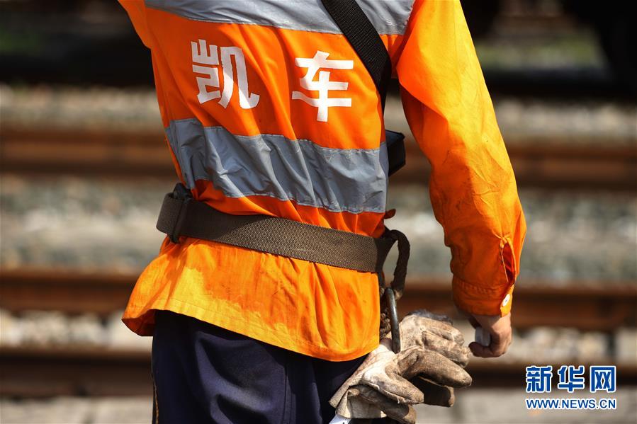 7月17日,在贵州省凯里车务段玉屏火车站,制动员资云飞的工服被汗水湿透。 新华社发(吴吉斌 摄)