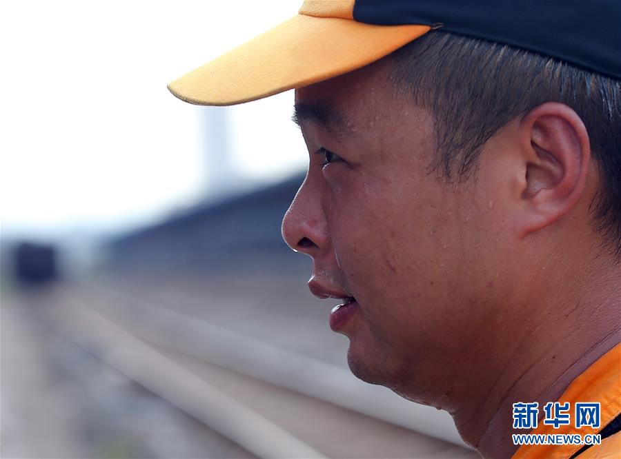 7月17日,在贵州省凯里车务段玉屏火车站,连结员刘健在烈日的灸烤下坚守岗位。 新华社发(张晖 摄)