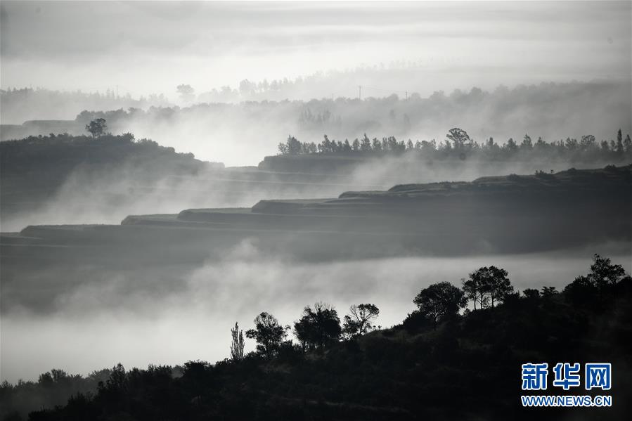 云雾缭绕的宁夏彭阳县金鸡坪梯田公园(7月17日摄)。 新华社记者 王鹏 摄