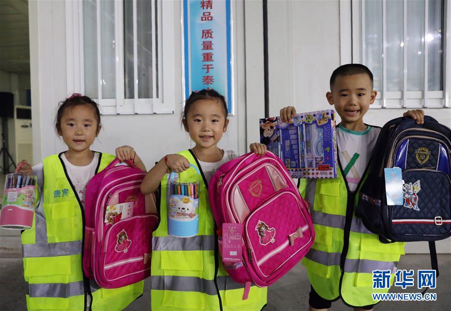 7月18日,农村留守儿童代表在中建八局重庆来福士项目工地展示刚刚获赠的书包、文具等礼物。