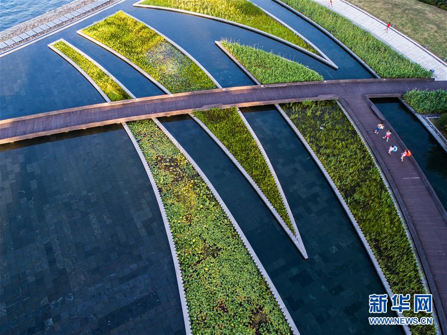7月17日,空中俯瞰淳安经济开发区珍珠广场前的沿湖景观带(无人机拍摄)。新华社记者 徐昱 摄