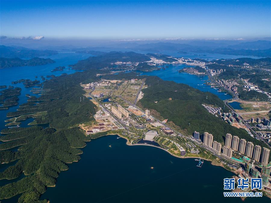 7月18日,空中俯瞰淳安经济开发区的沿湖景观带(无人机拍摄)。 新华社记者 徐昱 摄