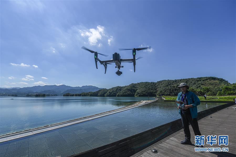 7月18日,摄影爱好者在淳安经济开发区的珍珠广场上航拍千岛湖风景。新华社记者 徐昱 摄