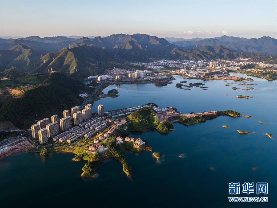 7月17日,空中俯瞰沿湖的淳安经济开发区(无人机拍摄)。新华社记者 徐昱 摄