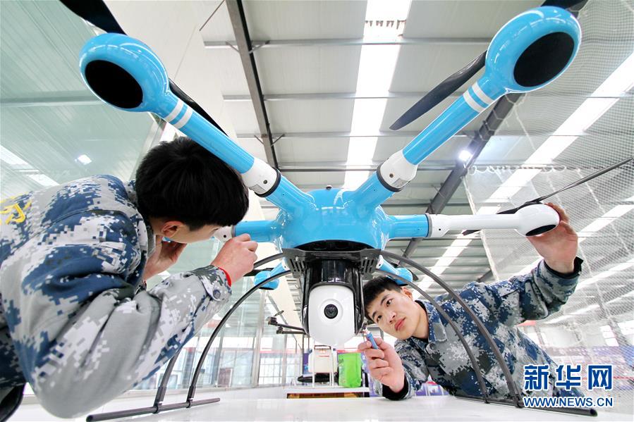 位于临漳县的河北三丰航空科技发展有限公司技术人员在调试多旋翼无人机(2017年12月26日摄)。新华社记者 牟宇 摄