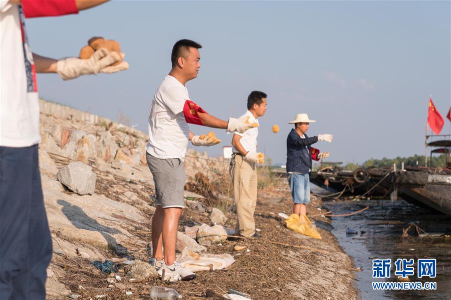 7月18日,防疫人员在洞庭湖区撒放杀灭血吸虫尾蚴药物。 新华社发(万志云 摄)