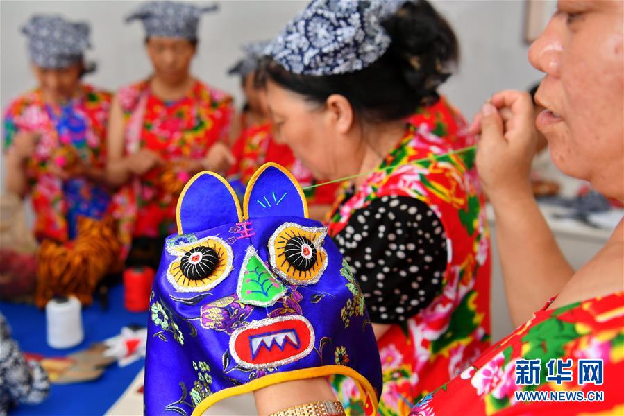 7月18日,临县寨则坪村的村民们在缝制工艺品。 新华社记者 曹阳 摄