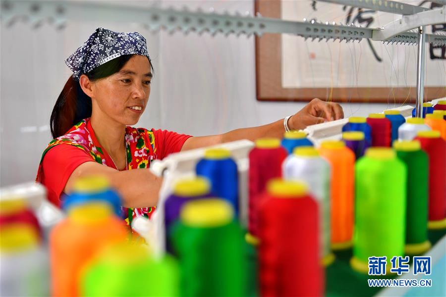 7月18日,临县寨则坪村的村民在用机器为布料绣花。 新华社记者 曹阳 摄