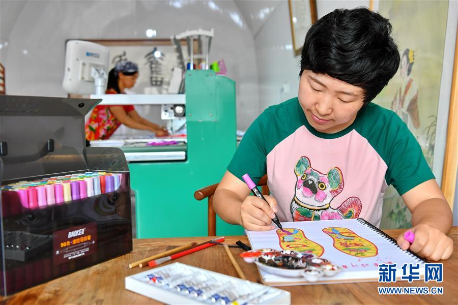 7月18日,临县寨则坪村的第一书记杜亮姝在设计鞋垫。 新华社记者 曹阳 摄