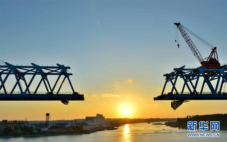 7月18日,徐宿淮盐铁路(徐州-宿迁-淮安-盐城)盐城段新洋铁路桥即将合龙。 新华社发(蒋晓鹏 摄)
