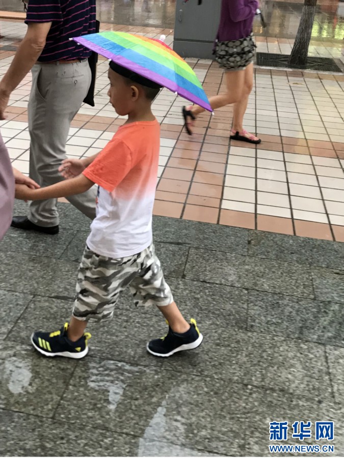 在王府井步行街,雨中的孩子。新华网发 孙蕾/摄