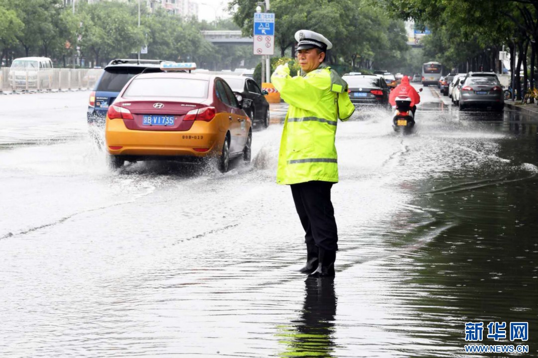 17日下午,在西直门北大街路口,交警在雨中指挥交通。新华网发 北京市交管局供图