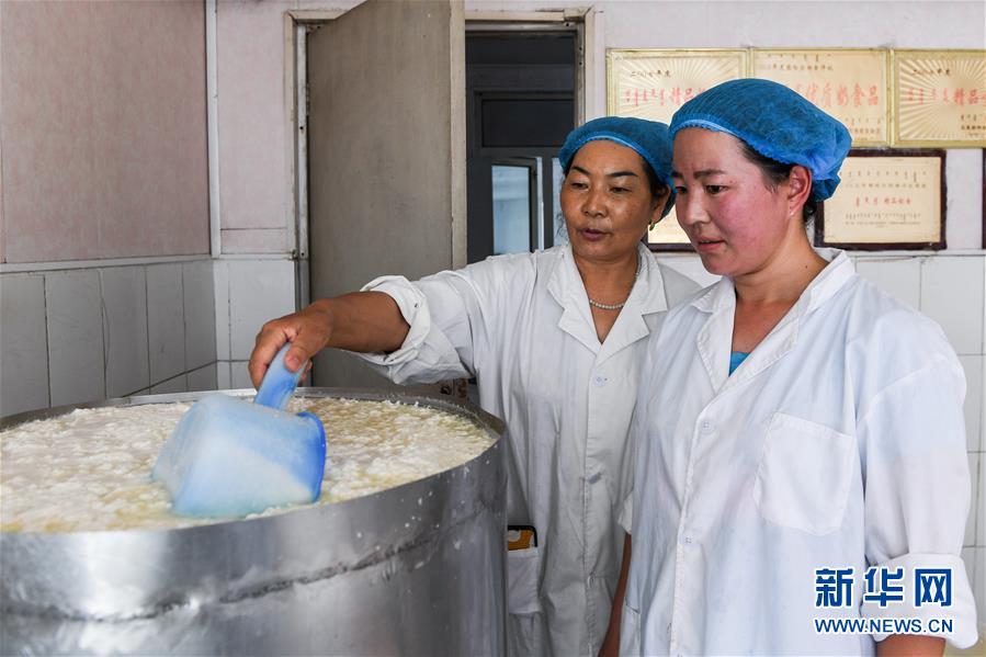 7月18日,在奶制品店内,陶高(左)在指导乌仁如何加热发酵牛奶。乌仁在城区生活,她刚来陶高家学习不到一周时间。 新华社记者 刘磊 摄