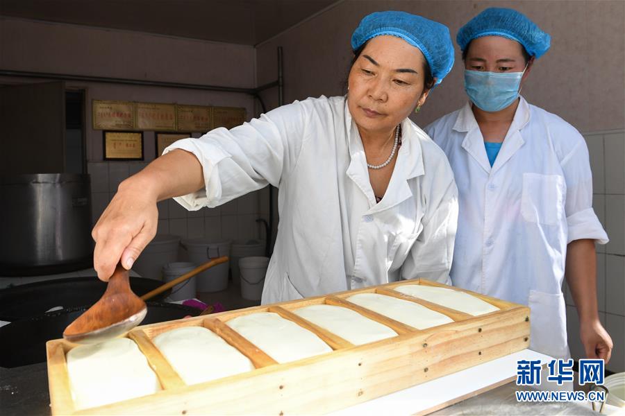 7月18日,陶高(左)为乌仁演示将搅拌好的乳团放入模具。 新华社记者 刘磊 摄