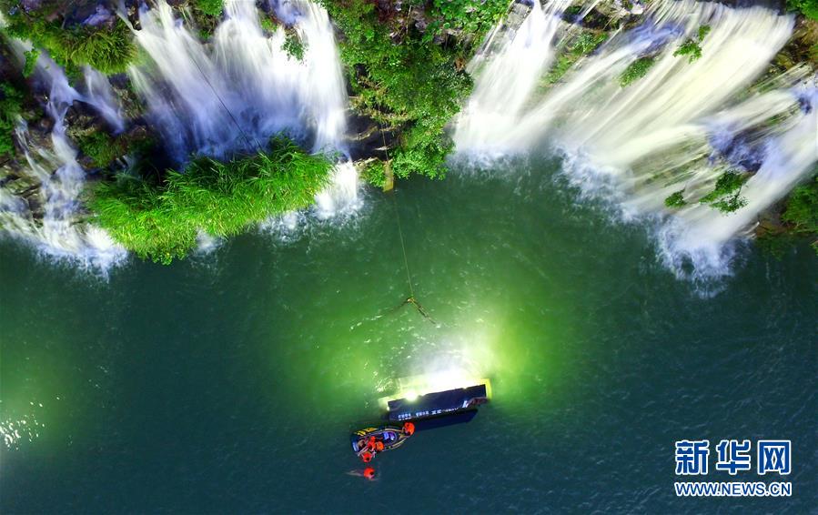 7月18日,市民在广西柳州市蟠龙山瀑布群下戏水消暑(无人机拍摄)。新华社发(黎寒池 摄)