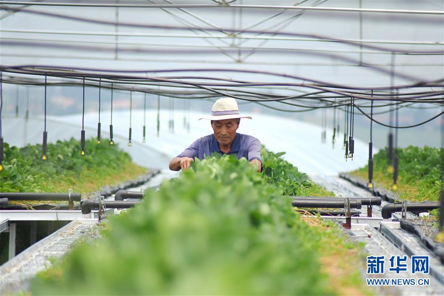 7月18日,农民在山东省淄博市沂源县鲁村镇于家石沟村一农业园区的育苗车间管护秧苗。 新华社发(赵东山 摄)