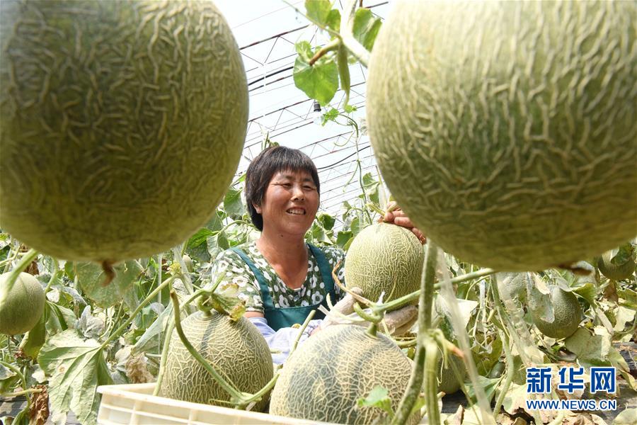 7月18日,农民在山东省淄博市沂源县鲁村镇于家石沟村一农业园区采摘网纹瓜。 新华社发(赵东山 摄)