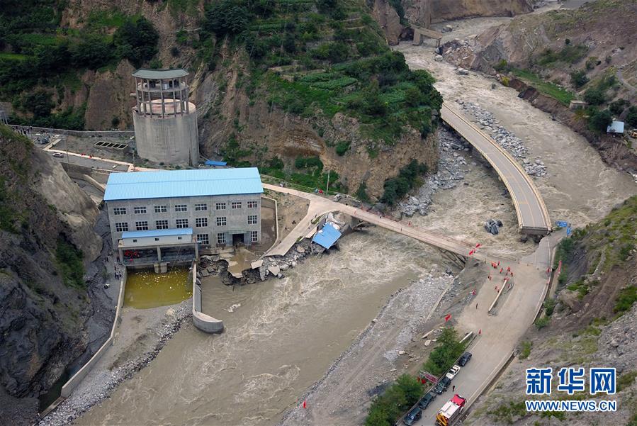 这是在舟曲县南峪乡拍摄的江顶崖滑坡体下游的发电厂厂房(7月19日无人机拍摄)。