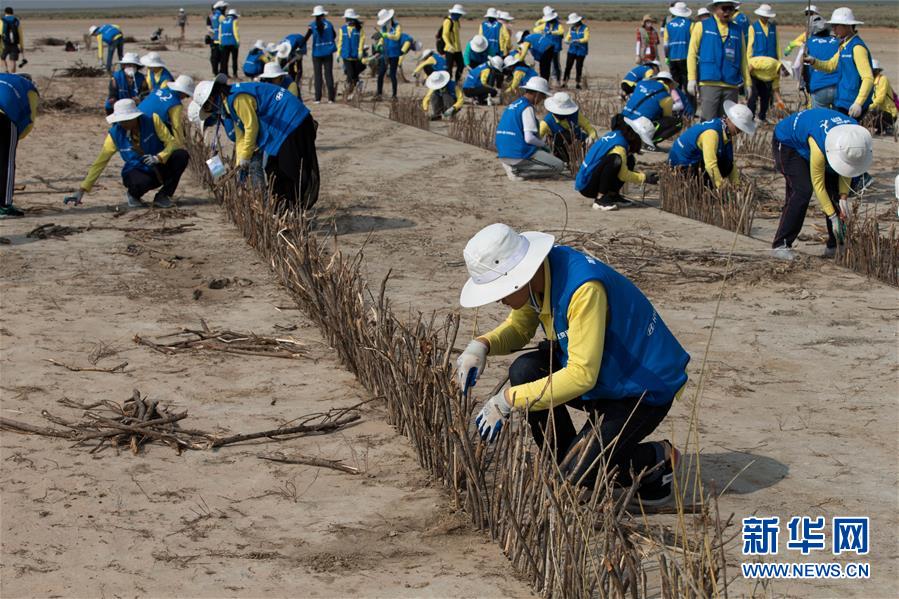 7月19日,大学生志愿者在内蒙古自治区正蓝旗宝绍岱诺尔插沙障。 新华社记者 孟鼎博 摄