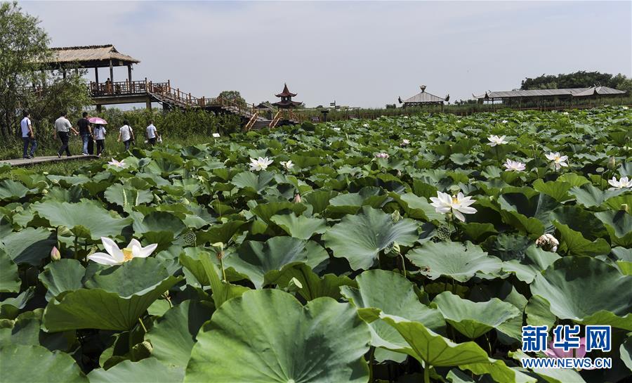 7月19日,游人在合阳县黄河湿地观赏盛开的荷花。新华社记者 陶明 摄