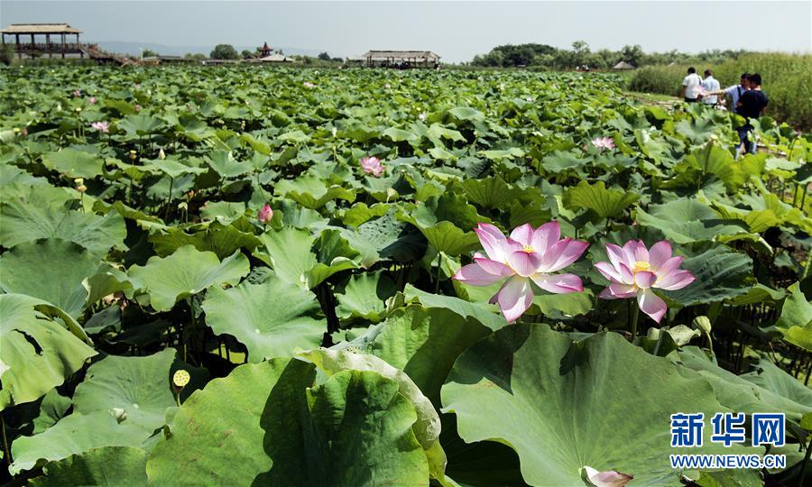 7月19日,游人在合阳县黄河湿地观赏盛开的荷花。新华社记者 刘莲芬 摄