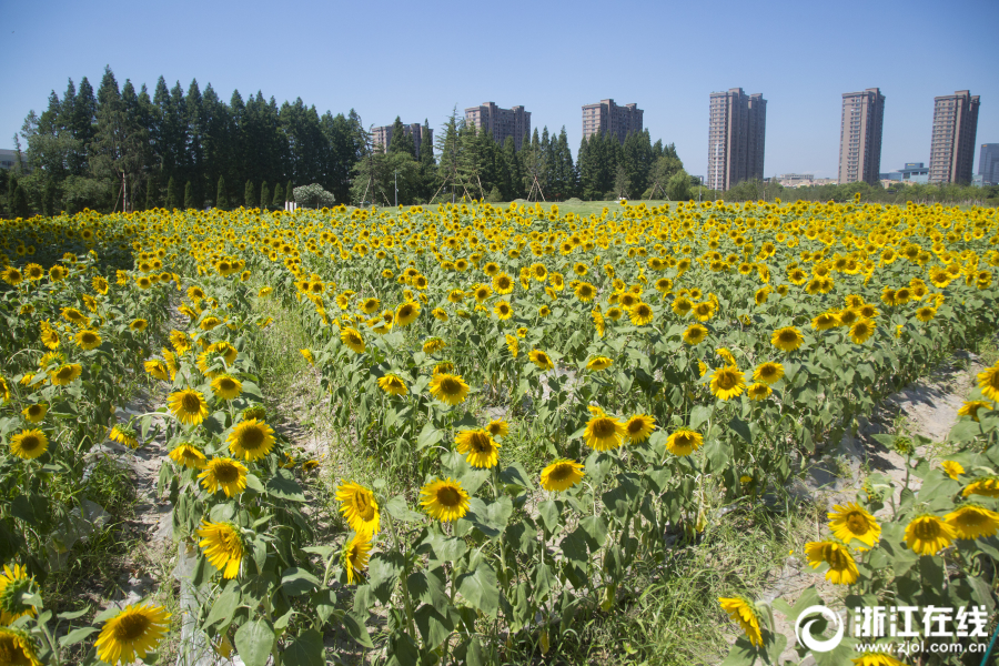 天空湛蓝,花海金黄,7月19日,杭州城北体育公园一片向日葵盛开。烈日当头,市区温度突破36℃,向日葵似乎都被晒得不耐烦,花瓣阴影形成的“囧”脸,成了逗趣的“表情包”。据悉,这里曾是城中村,绿化改造后,如今花海养眼,成了周边居民的散步好去处。(记者 倪雁强 摄)