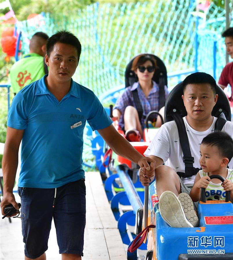 7月19日,在广西融水双龙沟森林旅游度假区,贫困户韦志东在引导游客游玩。他是充电飞鼠游玩项目的工作人员,每个月有2000多元的收入。新华社记者 黄孝邦 摄