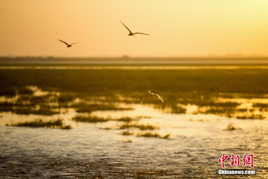 7月19日在江西九江市永修县吴城镇拍摄的鄱阳湖湿地风光。盛夏的鄱阳湖湿地水草碧绿,河道蜿蜒,在夕阳的映衬下,呈现出“落霞与孤鹜齐飞,湖水共长天一色”的美丽景观。中国第一大淡水湖鄱阳湖湿地是最早七个列入国际重要湿地名录的湿地之一,蕴藏着丰富的动植物资源和独特的自然景观。 傅建斌 摄