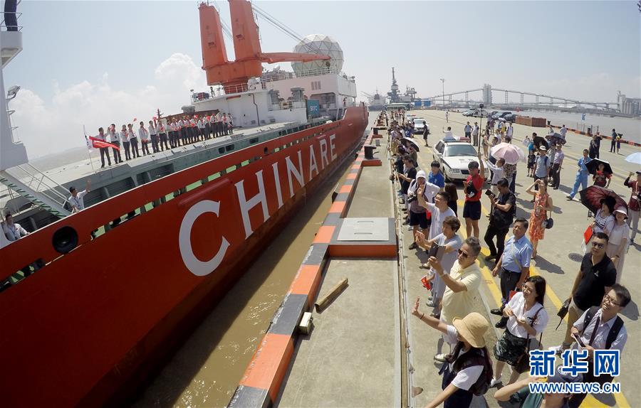 7月20日,科考队员代表们在“雪龙”号甲板上列队,与码头上送行的亲友告别。 新华社记者 方喆 摄