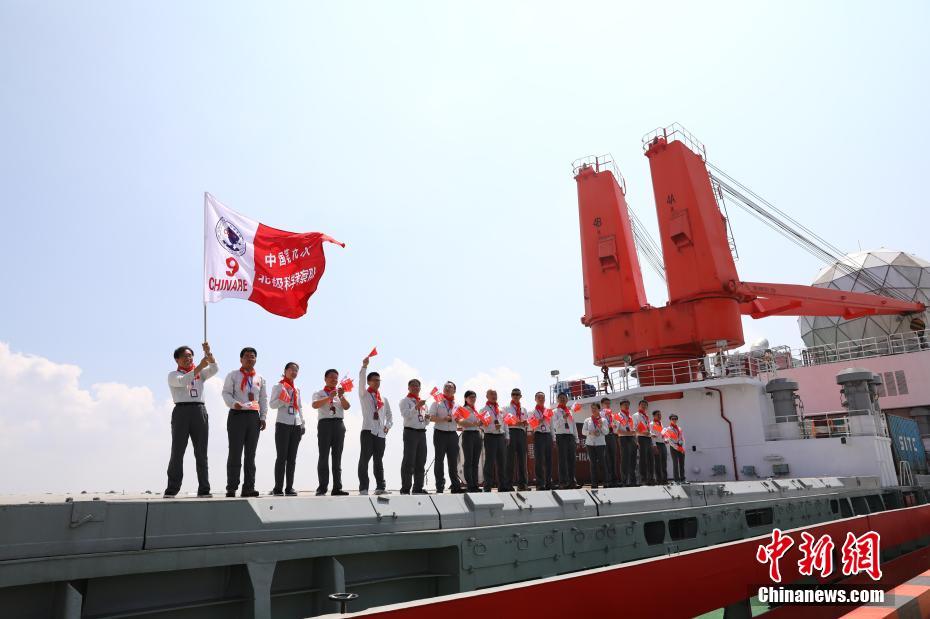 7月20日,中国第9次北极科学考察活动正式起航。考察队乘坐“雪龙”号极地科学考察船,缓缓驶离位于上海浦东的中国极地考察国内基地码头,奔赴北冰洋。图为科考队员代表们在“雪龙”号甲板上列队,与码头上送行的亲友告别。中新社发 蒋小威 摄