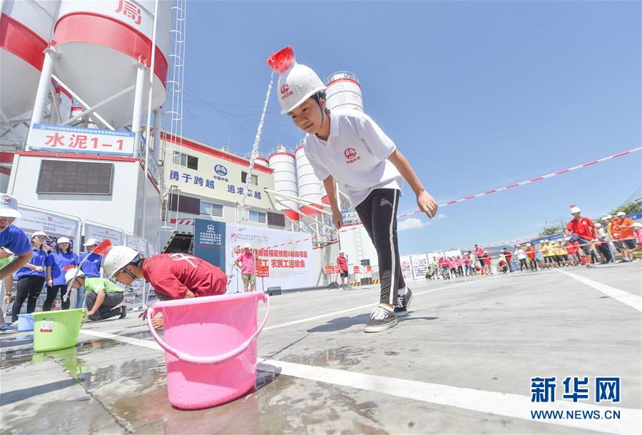 7月21日,在福建省厦门市新建福厦铁路8标段项目工地,中铁四局的建设者在参加安全帽运水比赛。