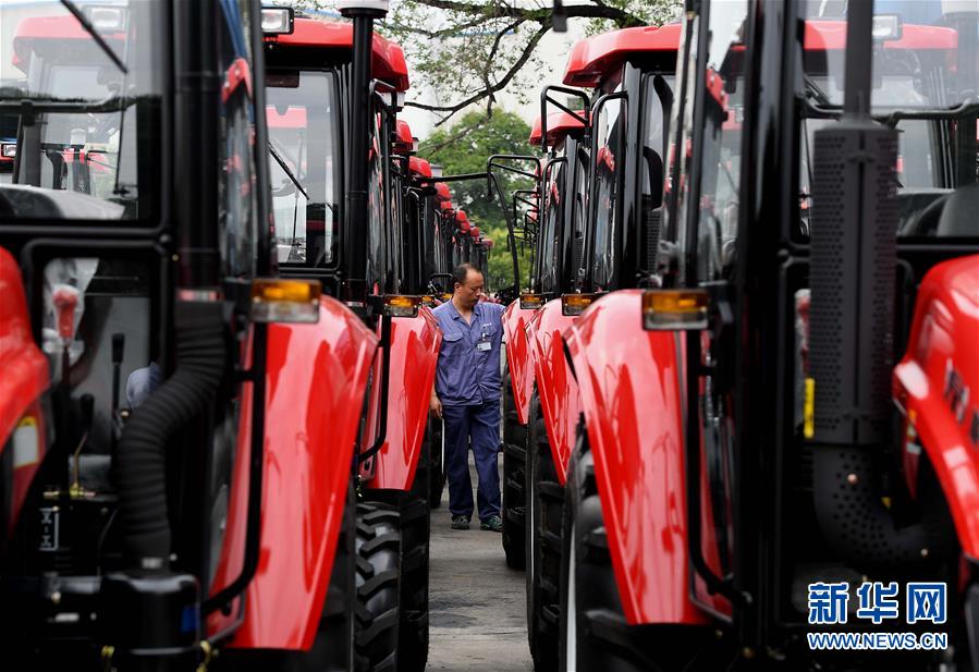 工作人员在位于河南洛阳的中国一拖集团有限公司第三装配厂查看即将出口到塞尔维亚的东方红拖拉机(6月27日摄)。