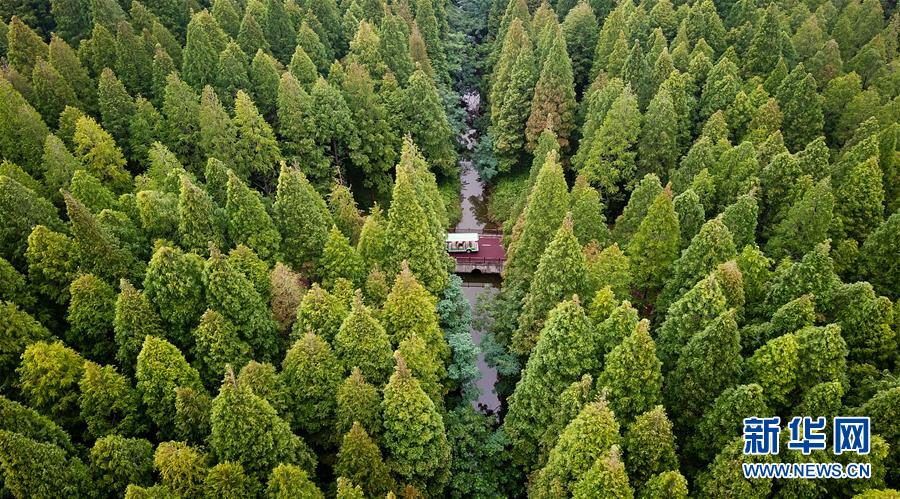 7月22日,观光车在黄海国家森林公园里穿梭(无人机拍摄)。 新华社记者李响摄