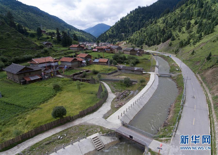 四川省松潘县牟尼乡包座村一角(7月22日无人机拍摄)。岷江支流牟尼沟河的河堤经过加固后,不仅可以避免河水上岸进房,而且使得公路更加安全。 近年来,位于岷江上游的四川省松潘县共新增1984个河道管护员、草原看护员等公益性岗位,助推生态保护与脱贫攻坚齐头并进。松潘县通过专为贫困户设立生态公益性岗位,落实森林管理330余万亩,草原禁牧150万亩,河道管护620余公里,在岷江上游和源头区竖起了一道生态屏障。 新华社记者 江宏景摄