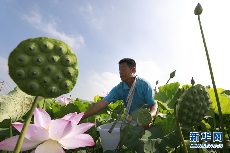 7月22日,藕农在江苏省淮安市盱眙县黄花塘镇老营虾藕共生示范基地采摘莲蓬。 新华社发(周海军 摄)