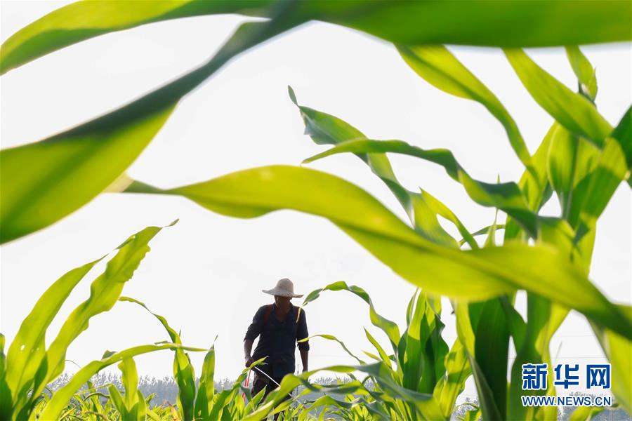 7月22日,农民在江苏省淮安市盱眙县古桑街道季安村玉米地里劳作。 新华社发(周海军 摄)
