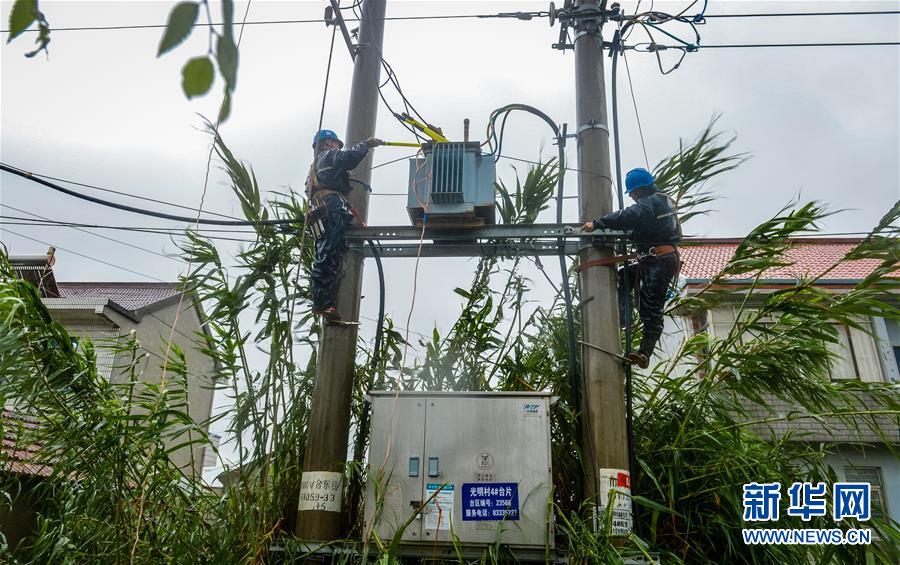 7月22日下午,在江苏省启东市南阳镇光明村,工人在雨中抢修被台风损坏的变压器。 新华社记者 李响 摄