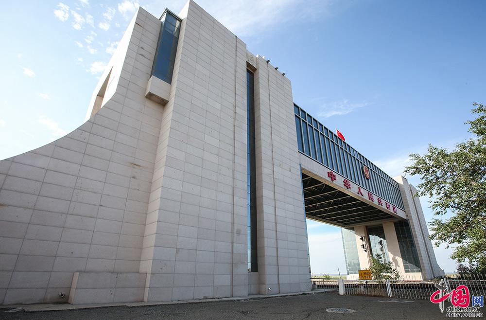 二连浩特国门于2007年建成,是自治区成立60周年献礼工程,总投资1200万元,建筑面积2406平方米,主体结构4层,长71.4米,宽13米,高21米,横跨准宽轨双辐铁路,气势磅礴,宏伟壮观。中国网记者 伦晓璇 摄