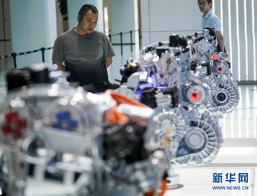 在吉利汽车(杭州湾)研发中心,参观者在观看展出的汽车发动机模型(7月3日摄)。小到牙刷、电池,大到汽车、轮船、大飞机……改革开放40年,中国制造坚持开拓,苦练内功,在与世界贸易伙伴携手共进中,逐渐融入全球贸易体系。新华社记者 沈伯韩 摄