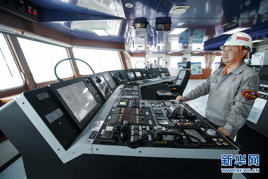 在沪东中华造船(集团)有限公司,总经理陈军展示船舶驾驶控制系统(7月5日摄)。小到牙刷、电池,大到汽车、轮船、大飞机……改革开放40年,中国制造坚持开拓,苦练内功,在与世界贸易伙伴携手共进中,逐渐融入全球贸易体系。新华社记者 沈伯韩 摄