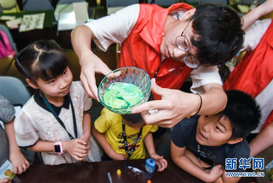 7月24日,小学生们在志愿者的指导下进行“彩色喷泉”科学实验。 当日,浙江省慈溪市的小学生们在大学生志愿者的指导下参加“星星点灯暑期大课堂”,进行“变色魔法”“瓶子吹气球”“彩色喷泉”等科学实验。 暑假期间,浙江省慈溪市钱海军志愿服务中心的志愿者们开展“星星点灯暑期大课堂”,以多元化的授课形式、生动的内容为当地的小学生提供了丰富的兴趣课程。 新华社记者 徐昱 摄