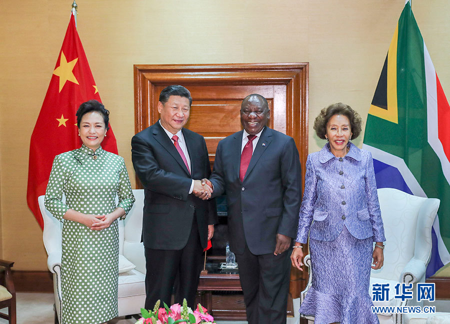 7月24日,国家主席习近平在比勒陀利亚同南非总统拉马福萨举行会谈。这是会谈前,习近平和夫人彭丽媛同拉马福萨和夫人莫采佩合影。 新华社记者 谢环驰 摄