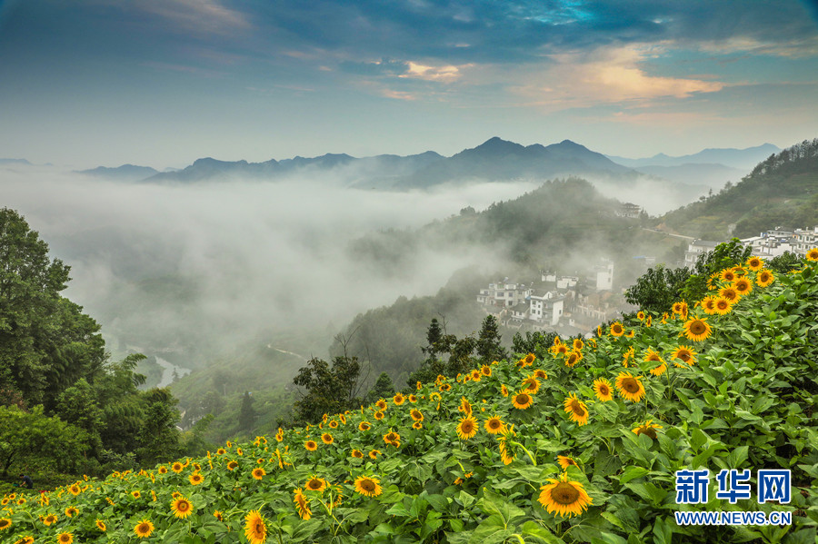 7月24日,在安徽黄山歙县霞坑镇石潭风景区雨后放晴,出现了壮观迷人的云海美景。金黄色向日葵花海在云雾弥漫中若隐若现。