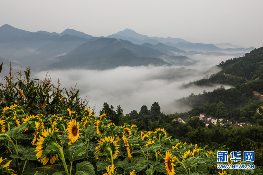 7月24日,在安徽黄山歙县霞坑镇石潭风景区雨后放晴,出现了壮观迷人的云海美景。金黄色向日葵花海在云雾弥漫中若隐若现。
