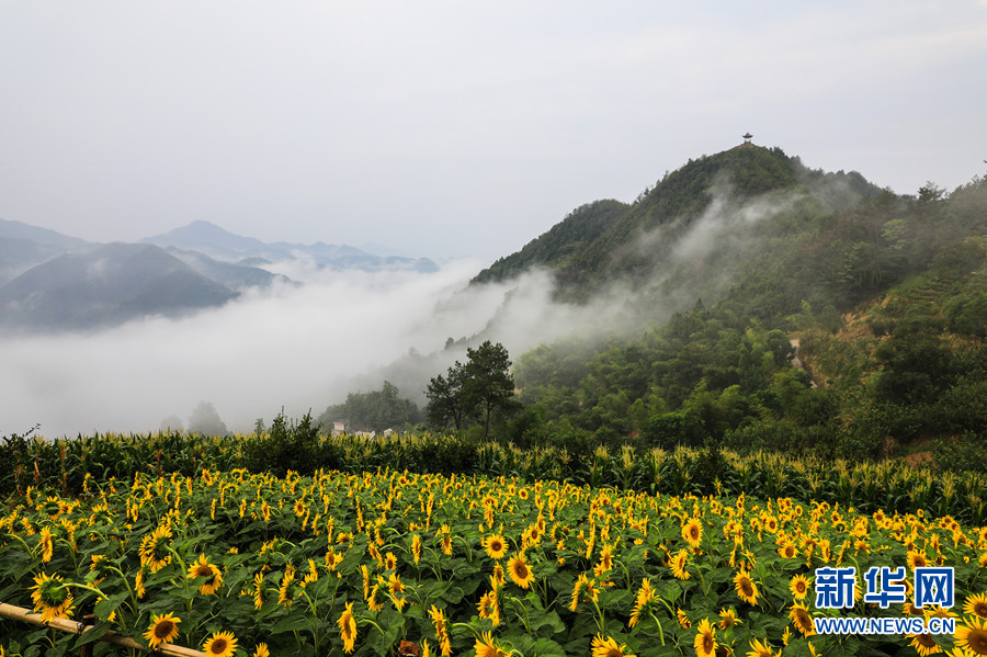 7月24日,在安徽黄山歙县霞坑镇石潭风景区雨后放晴,出现了壮观迷人的云海美景。金黄色向日葵花海在云雾弥漫中若隐若现。