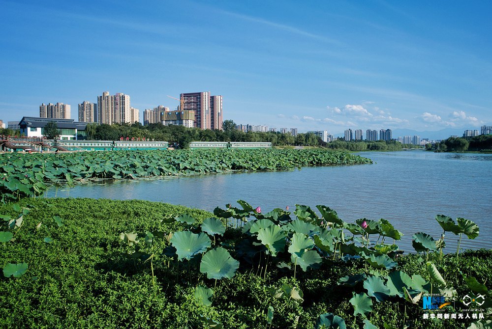 无人机视角下的西安浐灞湿地公园。新华网 申博望 摄
